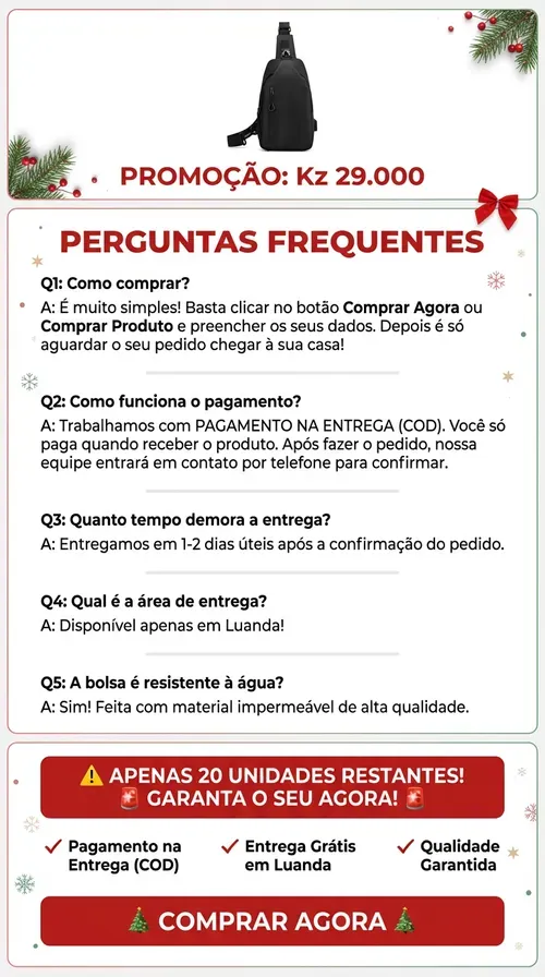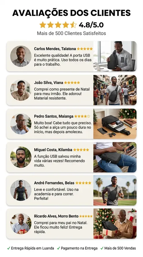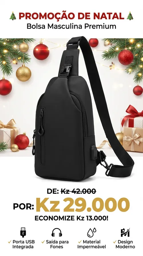 🔥 Bolsa Masculina Moderna com USB — Promoção Especia— 25.000 Kz🚫 Apenas 30 unidades 📦 Entrega grátis— Pague só ao receber 1296 vendas